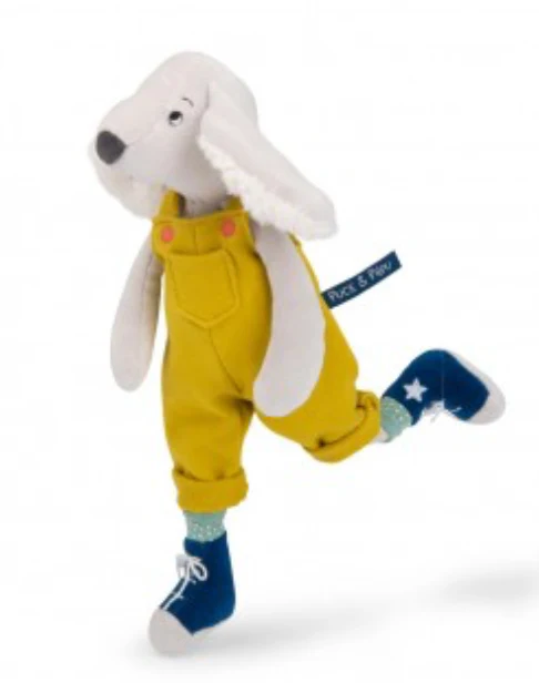 From Moulin Roty Pilou theĀ playful littleĀ dog, with its large, soft ears and cute yellow overalls, is just waiting to be cuddled.