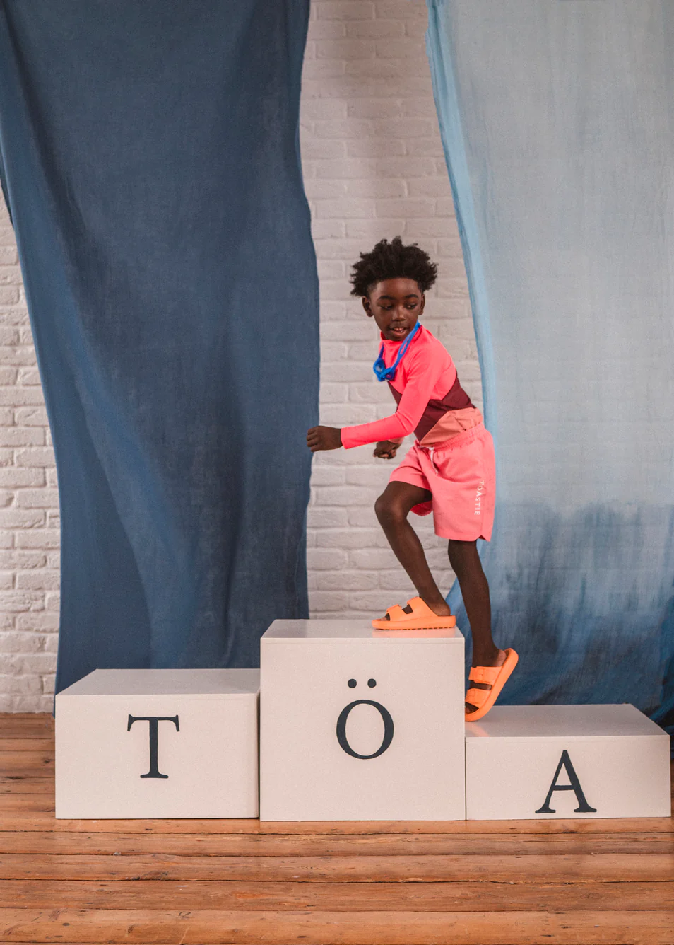 Peach soft swim shorts in bright eye catching colours so you can easily spot your little ones on the beach